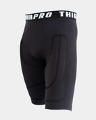 Umpire/Catcher thigh protective compression shorts with 4mm XRD® Pad that absorbs up to 90% of impact force by forming a comfortable protective shell repeatedly, impact after impact. *Cup pocket fits standard cups.